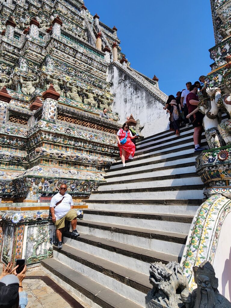Visited the amazing Wat Arun temple. You can take the stairs to the top to see a 360 degree view of Bangkok. I was looking forward to that. However, not only where the stairs steep, they were all about 14″ tall, and there were no handrails. I was bummed but decided to err on caution (Yeah, I know, not normally my style.) and come down after about 5 steps. Each step was so tall that it felt like I was doing squats to climb each one. Oh well.