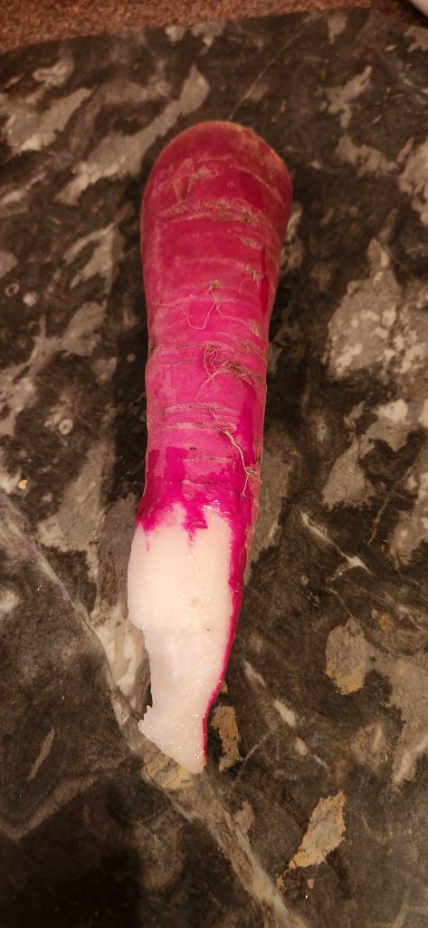 I boil eggs, cut up apples, red peppers and what I thought was a purple carrot. I realized pretty quickly that this was a strange carrot. The inside was white, not purple. I bit into the “carrot” and realized that it was a radish! All good, but I don’t like radishes, so was disappointed to say the least.