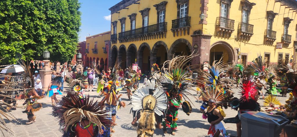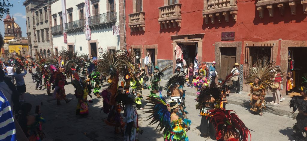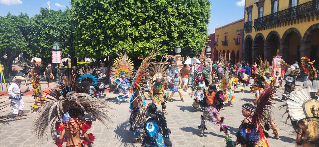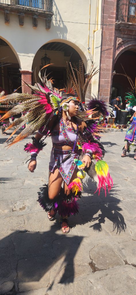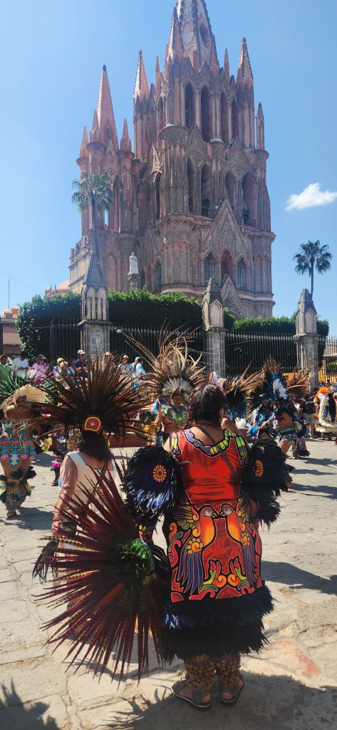 This festival takes place in the main square of San Miguel de Allende in front of the Parroquia de San Miguel Arcángel. I walked down from my apartment, and as I got close to the square, all I could hear was the loud beating of drums. When I approached the square, it was surrounded by hundreds of people dressed in native costumes and dancing to the beat of the drums. It was pretty spectacular.