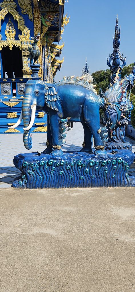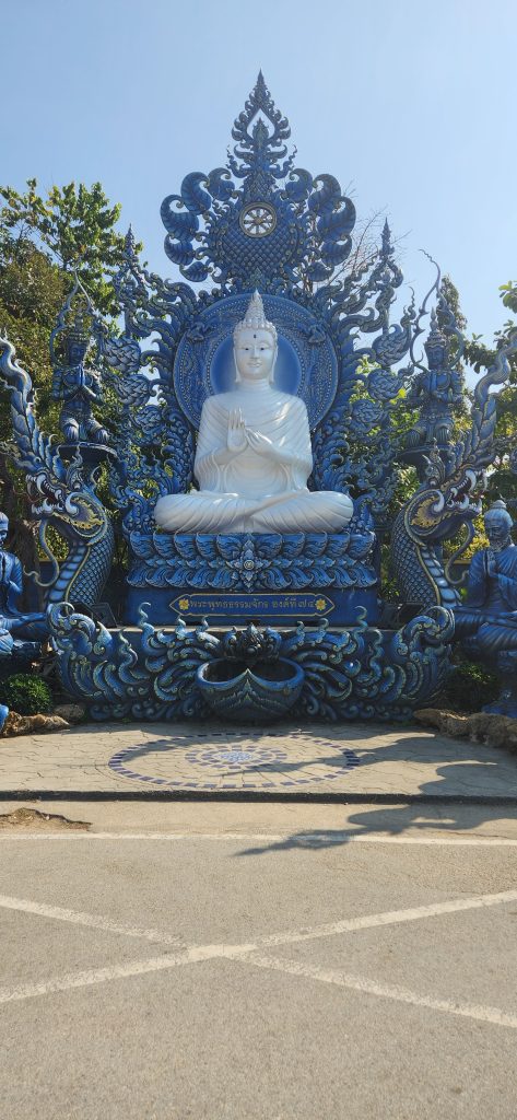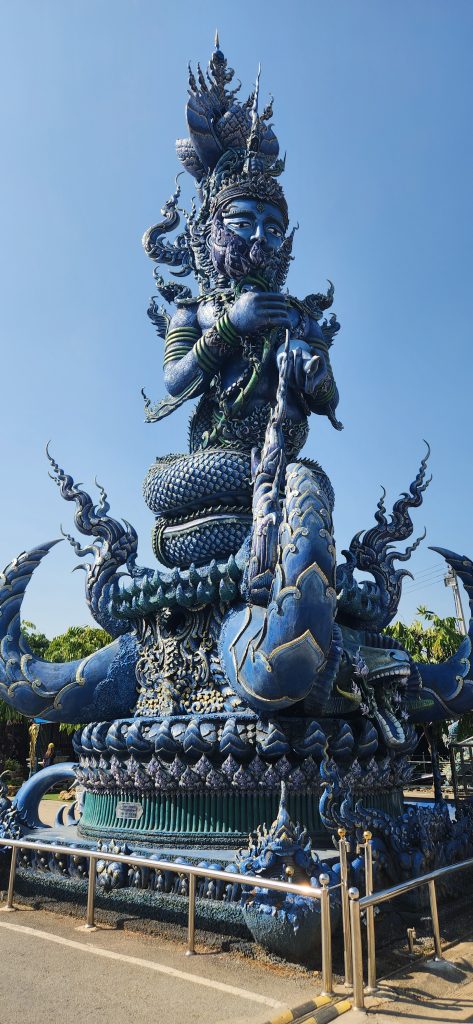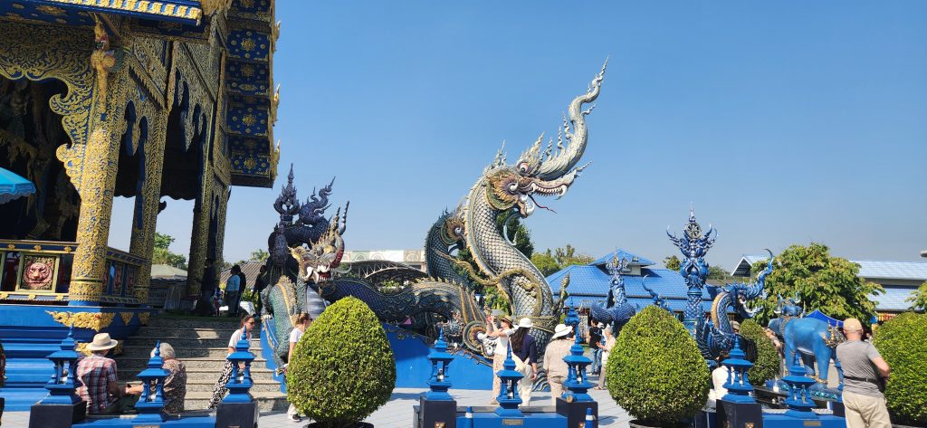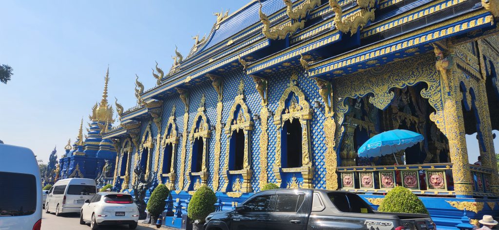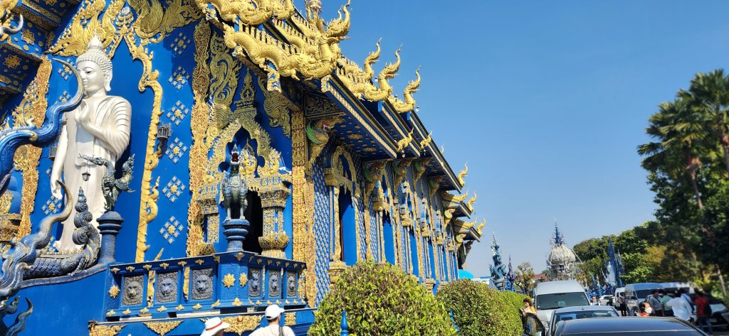 BLUE TEMPLE – Known for its striking modern artistic design, the temple’s construction was initiated by the local community in 1996 to replace an old abandoned temple which previously stood on the site, though construction did not start until 2005. Its final design was realized by local artist Phuttha Kabkaew, who learned from Chalermchai Kositpipat while working on his famous Wat Rong Khun, just outside the city. Wat Rong Suea Ten’s main building was completed in 2016, and follows in the unconventional “neo-traditional” style of Buddhist art pioneered by Chalermchai, employing lavishly ornamented sculptures and psychedelic visual imagery.