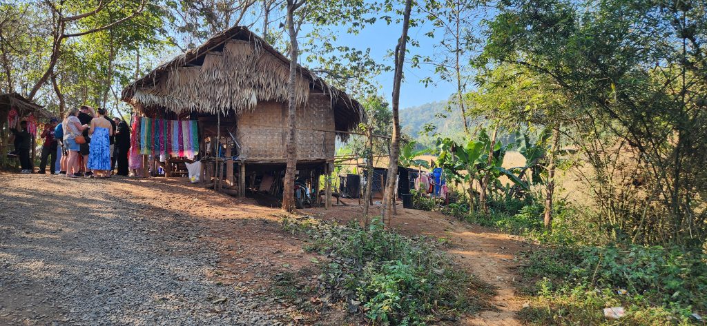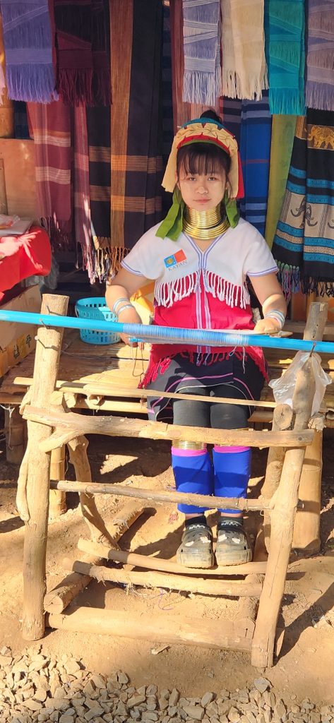 Along the way we stopped at the Long Neck Karen tribe, escaping Myanmar conflict, they settled in the mountains of northern Thailand. What distinguishes these villages are the adorned women. With slender necks embellished by golden brass rings, they symbolize cultural identity. Beyond adornment, the women showcase artistry through intricate weaved goods, reflecting unique stories. It was interesting but felt more like a tourist stop. They sold wares, but were also gracious in allowing photos to be taken. Loved the artwork that graced the entrance to the village…