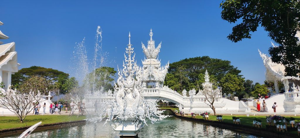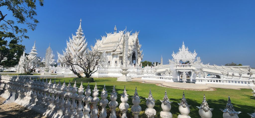It is a striking contemporary Buddhist temple designed by artist Chalermchai Kositpipat. Unlike traditional temples, it gleams in pure white, symbolizing the purity of the Buddha, with intricate glass mosaics that reflect light like diamonds. Its elaborate details blend classic Thai architecture with modern artistic elements, making it both a spiritual site and a unique work of art. The temple represents the path from earthly temptations toward enlightenment.
